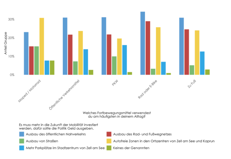 Beinahe 70% der Befragten geben an, im Alltag am häufigsten den PKW zu verwenden. Davon fordern nur 10%, dass in den Bau von Straßen investiert soll, über 30% wollen den Ausbau der Öffis, 20% ein besseres Rad- und Fußwegenetz und über 18% autofreie Zonen in den Ortszentren.