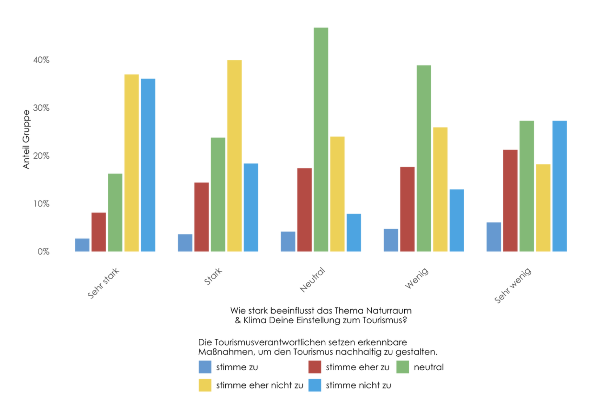 Wie sich zeigt, reichen für jene, deren Einstellung zum Tourismus stark vom Thema Naturraum & Klima geprägt ist, die gesetzten Maßnahmen, um den Tourismus nachhaltig zu gestalten aktuell NICHT aus.